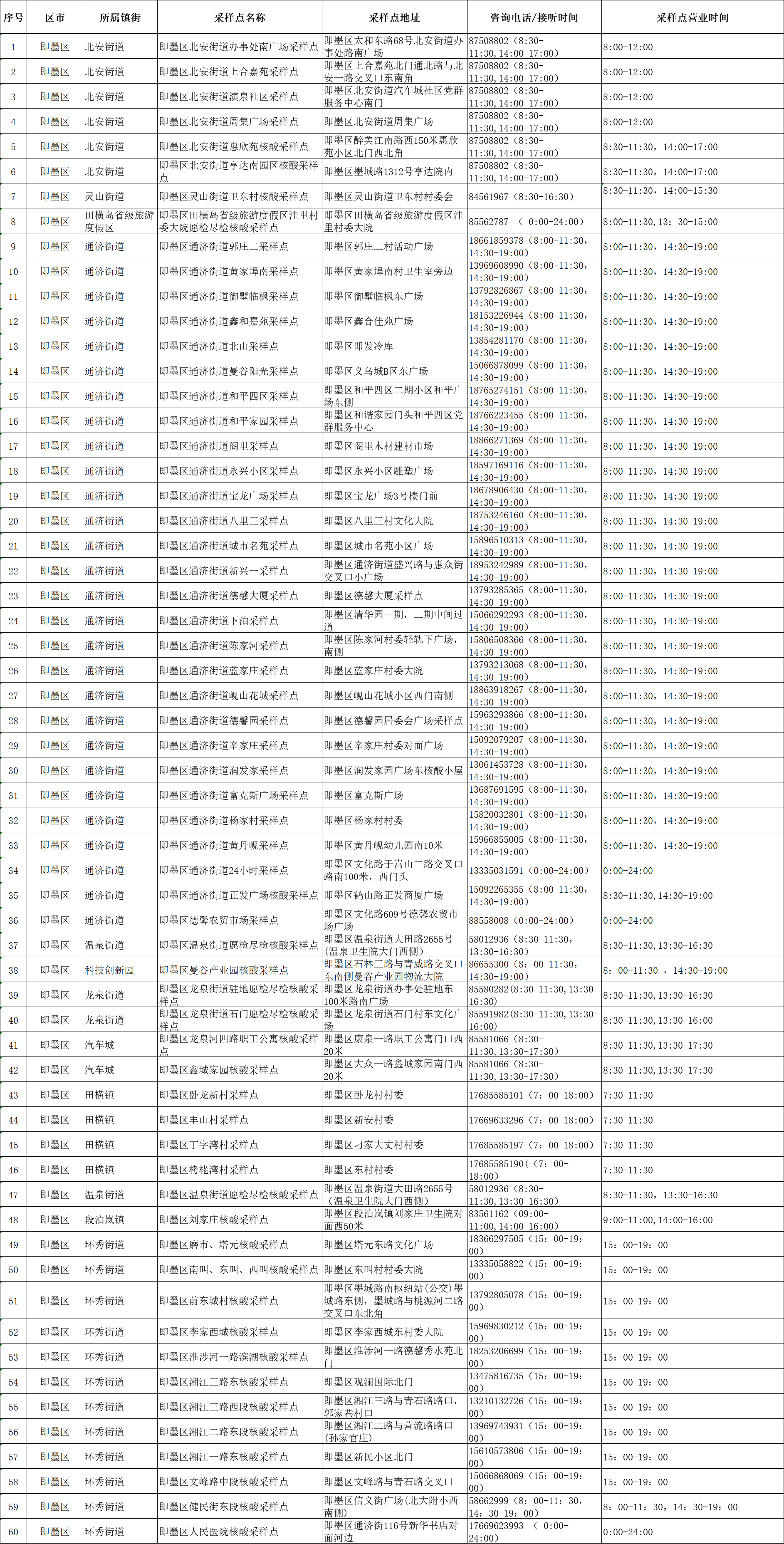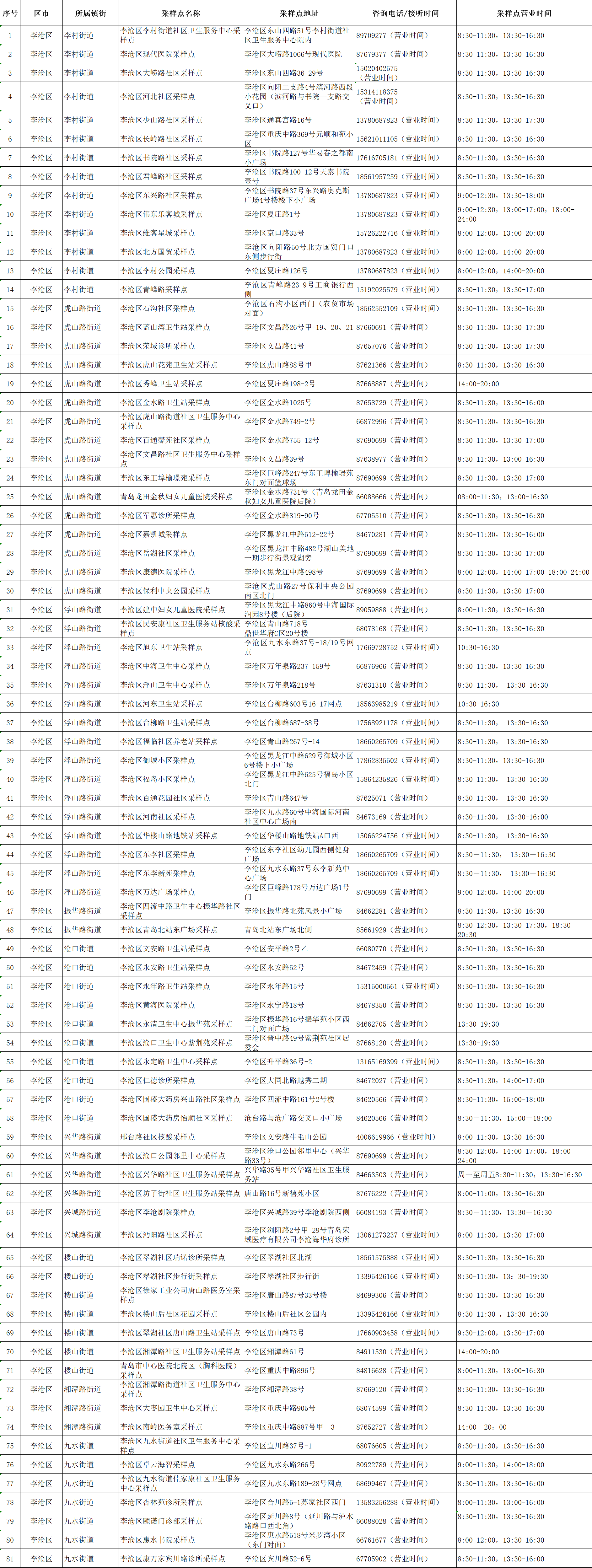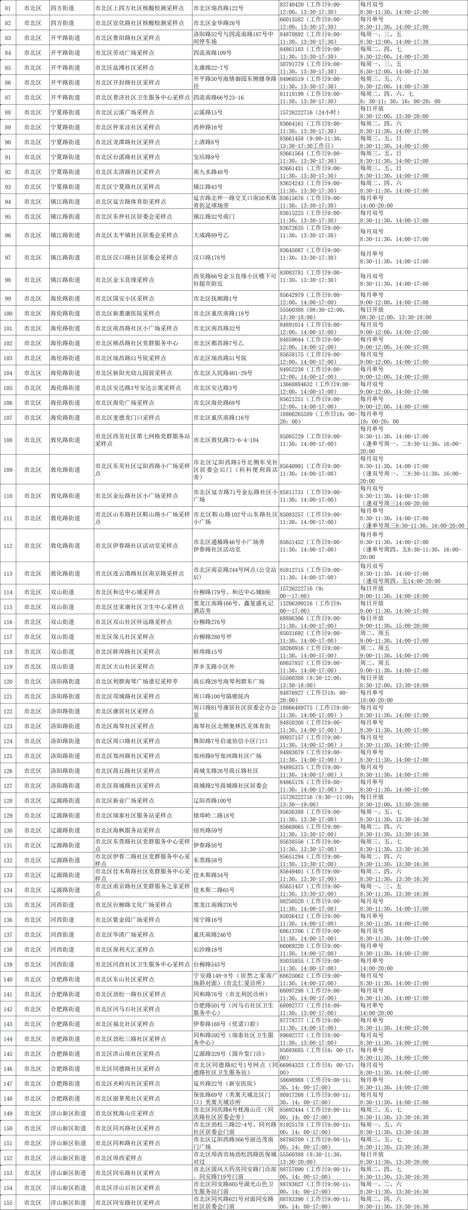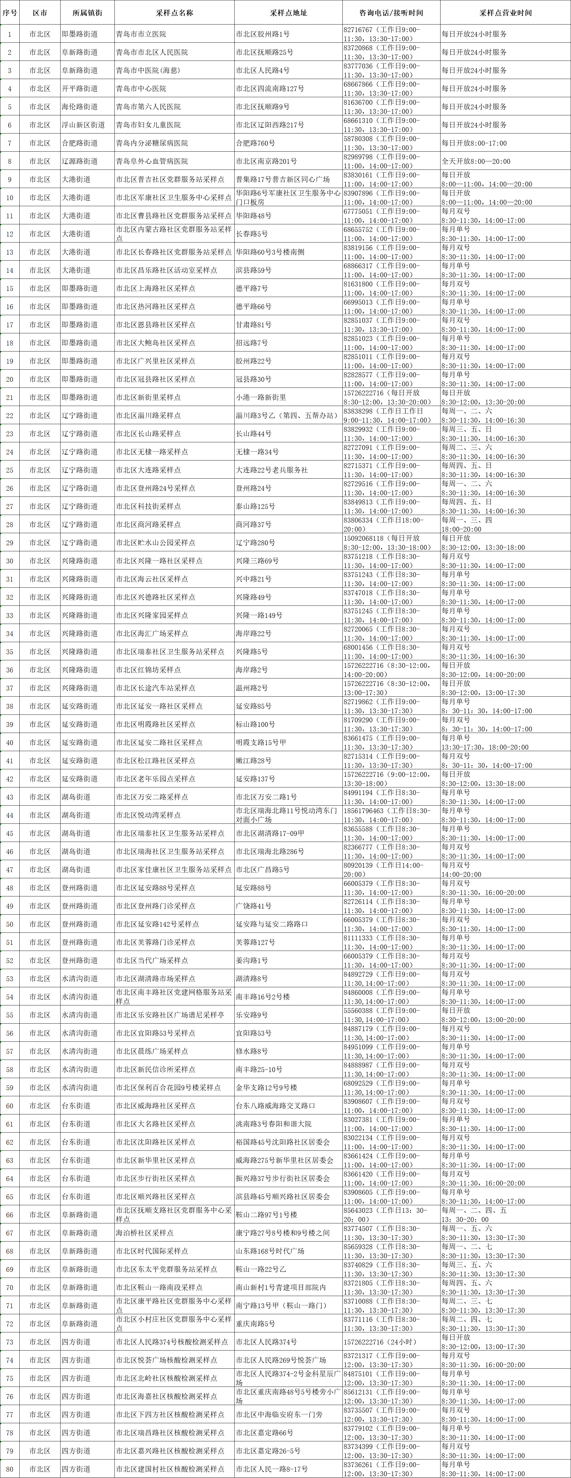为满足广大市民朋友就近就便核酸检测“愿检尽检”需求,并根据工作实际对采样点布局和服务时间等进行动态调整和优化,现汇总公布最新采样点信息,供大家查阅。请您仔细查阅各采样点的地址、工作时间和检测报告查询出具等相关提示,合理选择,若有疑问请提前咨询。
