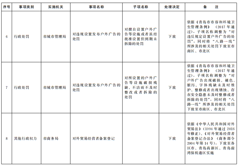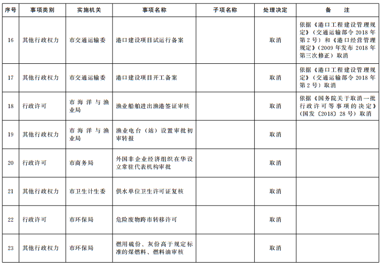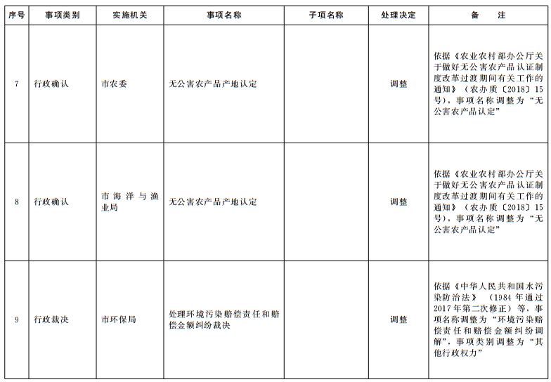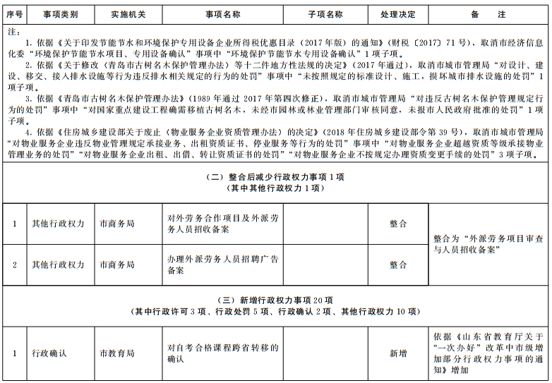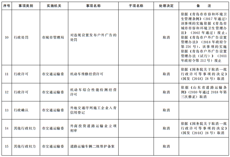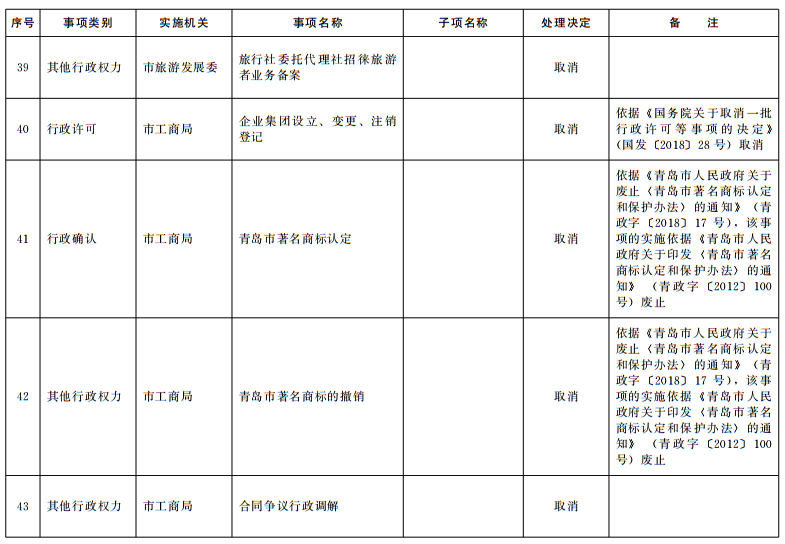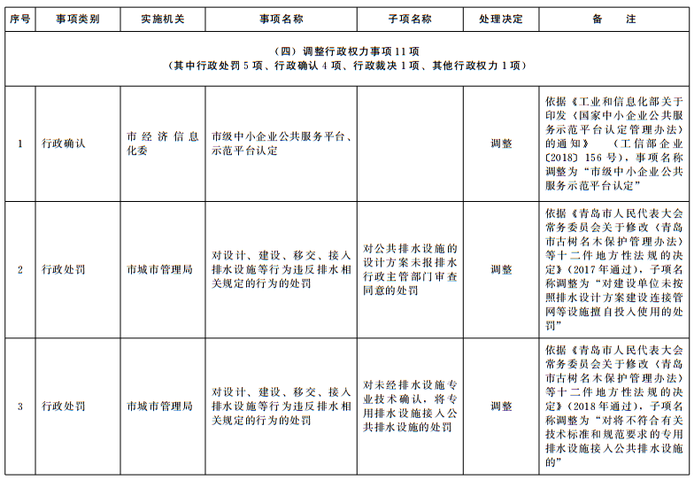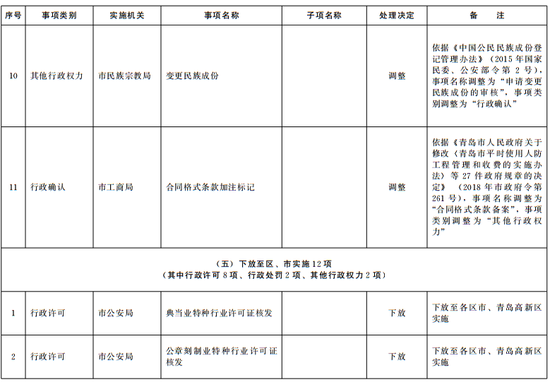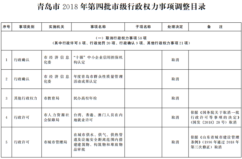 根据法律法规规章调整情况和《国务院关于取消一批行政许可等事项的决定》(国发〔2018〕28号)等文件要求,结合“一次办好”有关事项梳理工作,按照《山东省权力清单动态管理办法》(鲁政字〔2016〕76号)要求,现将我市2018年第四批市级行政权力事项调整目录予以公布。